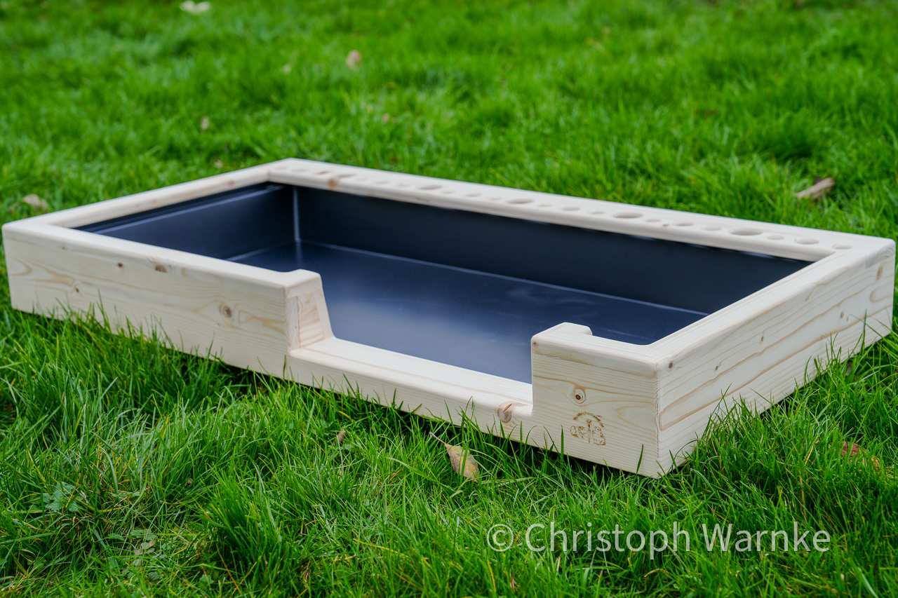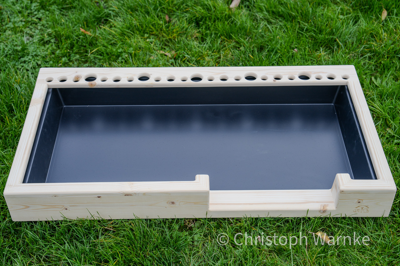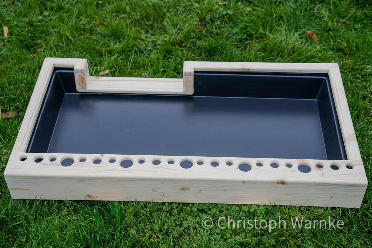 Der Einstieg für die Kunststoff-Schale wird von uns sorgfältig ausgesägt und abgeschliffen, sodass keine scharfen Kanten stehen bleiben, zudem sind die Kanten auch vom angepassten Holzrahmen komplett umgeben.