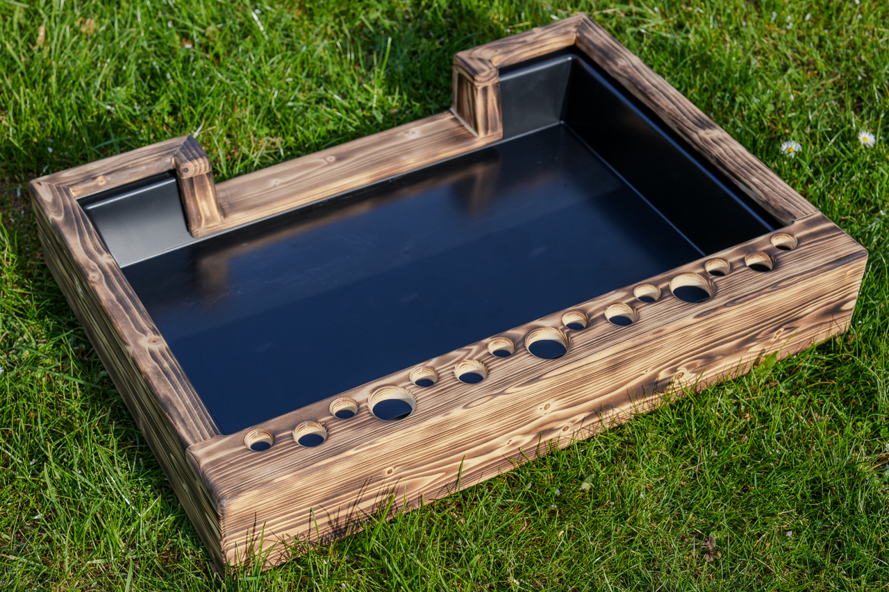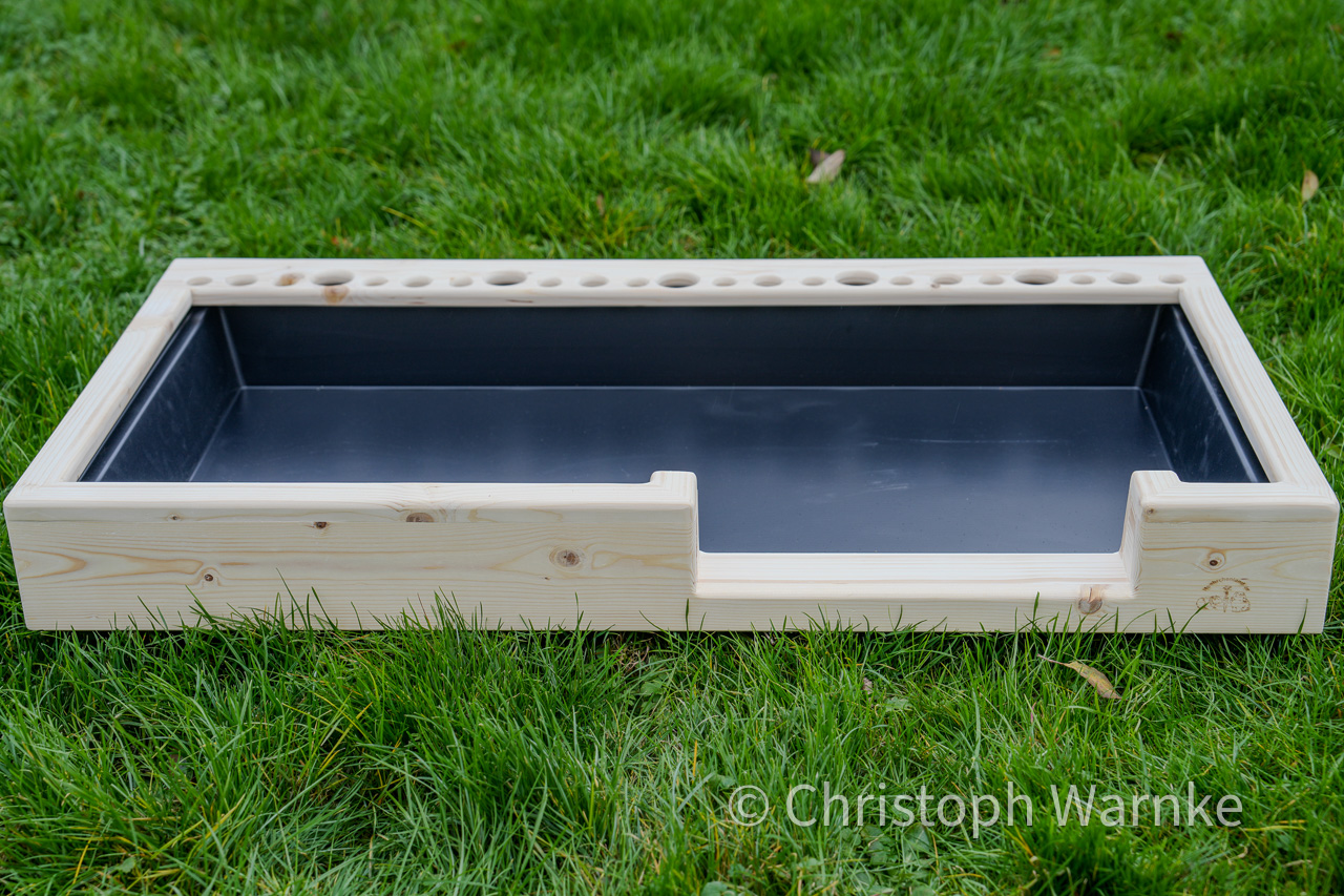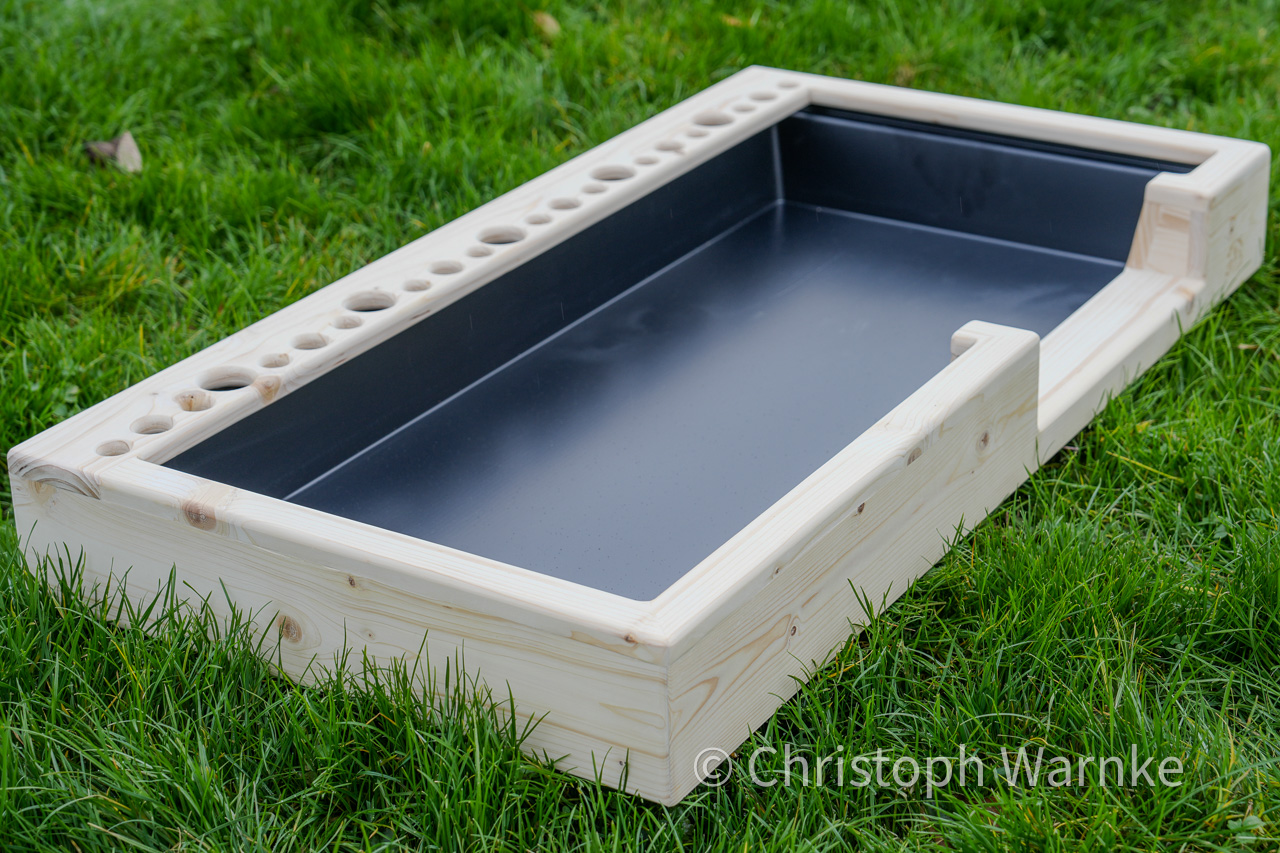 Der Einstieg für die Kunststoff-Schale wird von uns sorgfältig ausgesägt und abgeschliffen, sodass keine scharfen Kanten stehen bleiben, zudem sind die Kanten auch vom angepassten Holzrahmen komplett umgeben.